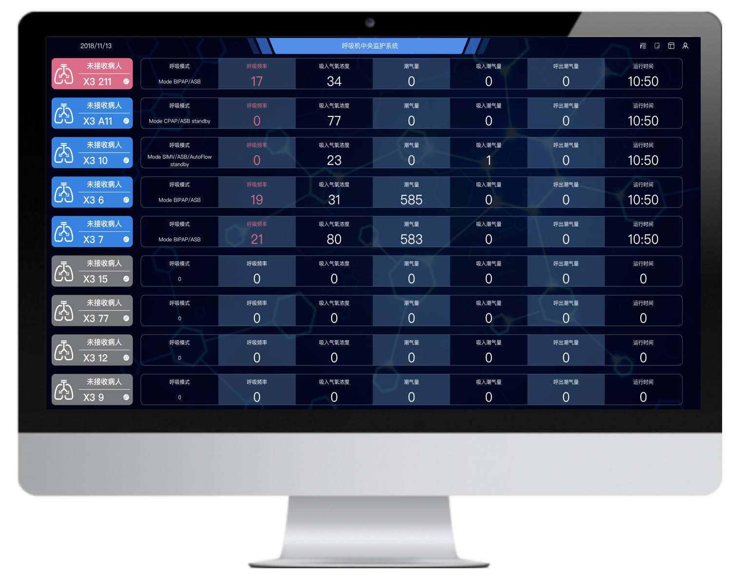 多臺不同品牌的有創呼吸機聯網,并通過大屏實時集中呈現治療預設參數和監(jiān)測參數,實現多臺集中監(jiān)測、集中管理和數據存儲。